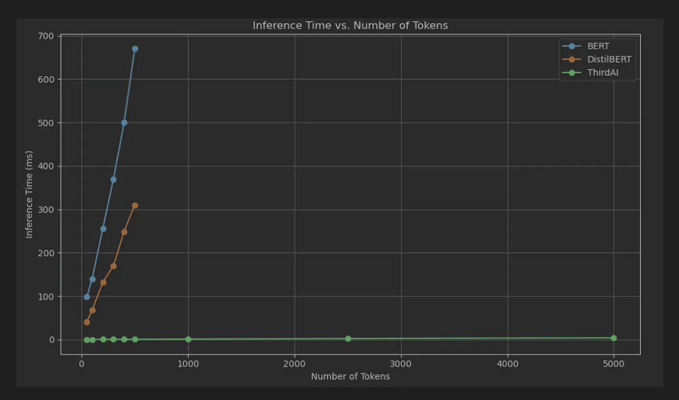 - Le graphique ci dessus montra le latence de classification de bout en bout (millisecondes) sur un seul cœur de processeur de BERT, DistilBERT et ThirdAI. L'axe des X représente le nombre de jetons dont la production peut varier de quelques à plusieurs milliers. La latence de ThirdAI est toujours inférieure à 10 ms. Tous les modèles sont réglés avec la même précision.